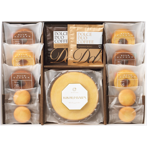 内容 ●バウムクーヘン(北海道産生乳100%の生クリーム使用)(約13φcm)×1、ミニバウム(チョコ・プレーン)×各3、チョコインクッキー×4、ドリップコーヒー×4 【賞味期限:90日】 【アレルゲン:卵・乳成分・小麦】 【化粧箱入】
