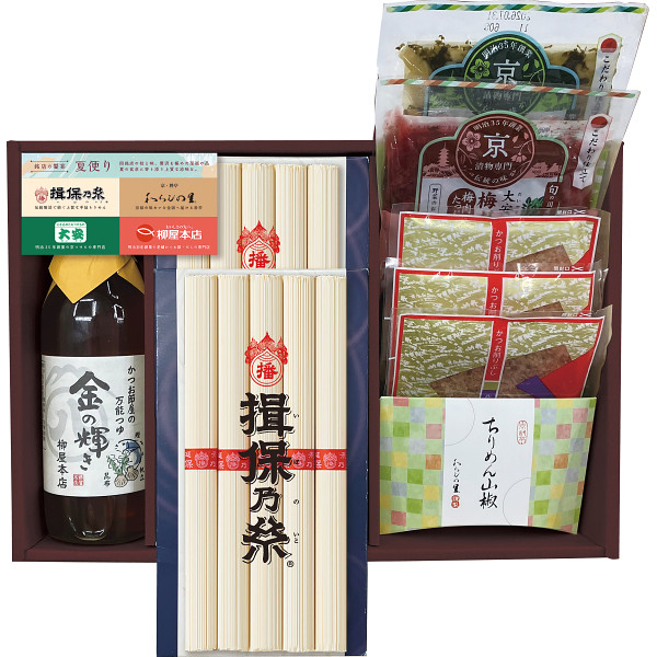 内容 ●大安の味すぐき(60g)・大安の梅だいこん(60g)・手延素麺揖保乃糸(上級品)(50g×5束)・柳屋本店 かつお節屋の万能つゆ 金の輝き(360ml)・ちりめん山椒(20g)×各1、花削り(かつお節3g)×2 【アレルゲン:小麦】 【化粧箱入】