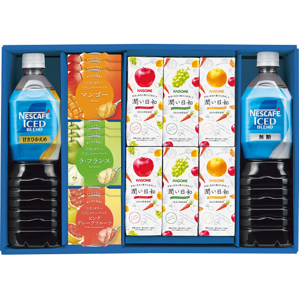 内容 ●シャーベットゼリー(山形ラフランス・マンゴー×各3・ピンクグレープフルーツ×2)各52g、ネスカフェアイスブレンドボトルコーヒー(無糖・甘さひかえめ)各900ml×各1、潤い日和(シャインマスカットミックス・清見オレンジミックス・ふじミックス×各2)各200ml 【アレルゲン:乳成分】 【化粧箱入】