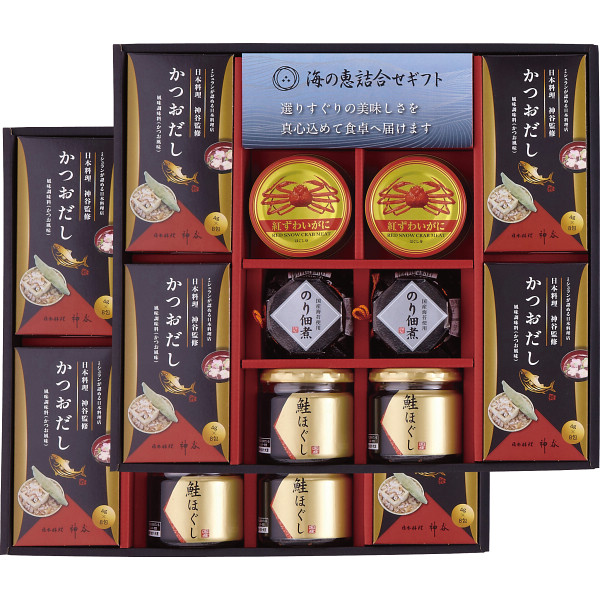 内容 ●(鮭ほぐし50g×2、のり佃煮80g×2、かつおだし(4g×8袋)×4、紅ずわいがにほぐし身55g×2)×各2 【アレルゲン:乳成分・小麦・かに】 【化粧箱入】