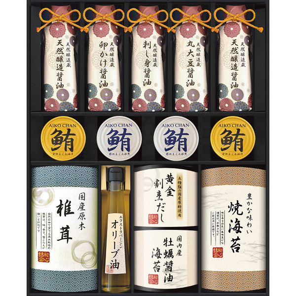 内容 ●焼き海苔(全型3枚入)×1、黄金割烹だしパック8g×4、牡蠣醤油海苔(海苔:国産)(8切6枚)×1、エクストラバージンオリーブオイル100g×1、国産原木椎茸×1、天然醸造蔵仕込み醤油(卵かけ醤油・刺し身醤油・丸大豆醤油)各200ml×各1、天然醸造蔵仕込み醤油(天然醸造醤油)200ml×2、金のまぐろ油漬け70g×2、銀のまぐろ水煮70g×2 【アレルゲン:小麦・えび】 【化粧箱入】