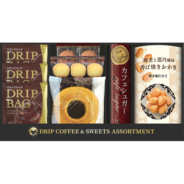 内容 ●セイコー珈琲ドリップコーヒー8g×3、ミルクバウムクーヘン×1、プレーンクッキー×3、クリームモンブランクッキー×2、海老と雲丹風味香ば焼きおかき40g×1、カフェシュガー3g×5 【アレルゲン:卵・乳成分・小麦・えび】 【化粧箱入】