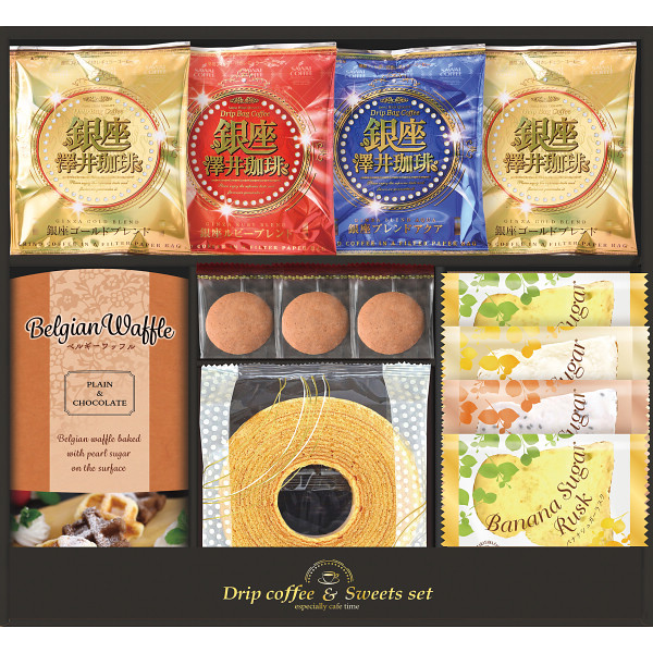 内容 ●銀座澤井珈琲ドリップコーヒー(ゴールドブレンド)8g×2、銀座澤井珈琲ドリップコーヒー(ルビーブレンド・ブレンドアクア)各8g×各1、ミルクバウムクーヘン×1、クリームモンブランクッキー×3、飛騨高山ファクトリーラスク(バナナ×2、シュガー×1、セサミ×1)、ベルギーワッフル(プレーン×2、ショコラ×1) 【アレルゲン:卵・乳成分・小麦】 【化粧箱入】