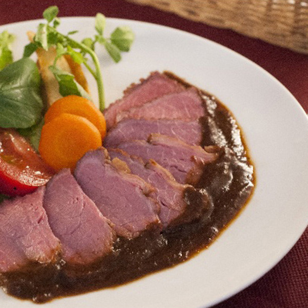 大正十二年創業の神戸の老舗洋食店「伊藤グリル」の姉妹店「アシエット」。塩、胡椒のみの味付けで、じっくり低温で調理したローストビーフは、肉の旨みを逃がさずしっとりジューシーな食感。デミグラスソースをベースにしたアシエットオリジナルソースでお楽しみください。