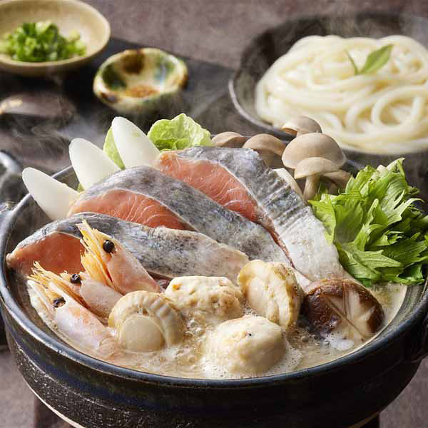 北海道産の秋鮭、帆立や、他にも海老、つみれなどを、味噌仕立てのたれでいただく北海道の郷土料理「石狩鍋」の具材を1~2人前の少量タイプにセットしました。お好みで野菜などを足していただくだけで本格的な鍋をお楽しみいただけます。〆はうどんでどうぞ!!