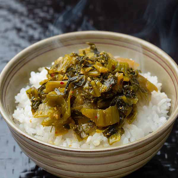 九州産の高菜を博多名産の辛子明太子と合わせました。高菜の油炒めと辛子明太子の相性も良く、ピリッとした辛みがごはんのお供に、またラーメンや炒飯にもよく合う逸品です。