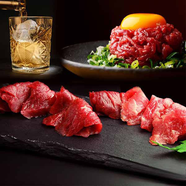 内容 赤身スライス40g×2、馬肉の細切り(ユッケ)50g、タレ50ml、ユッケのタレ15g 【アレルゲン:小麦】 【袋入】