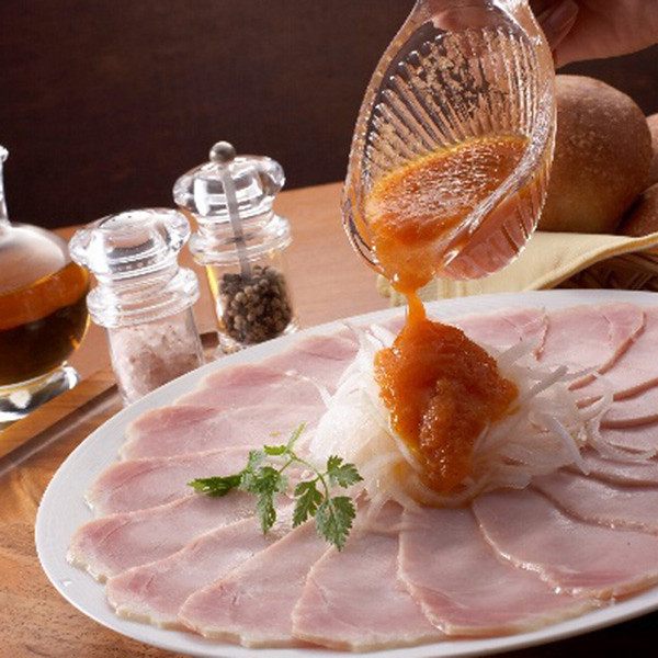 しっとりなめらかな白いハムは生野菜をたっぷりと使用したハム用ドレッシングと共にお召し上がり下さい。