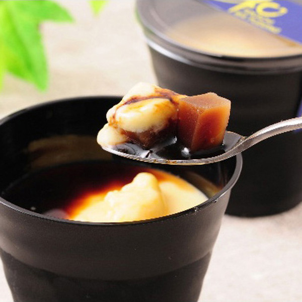 十勝橋本牧場の生乳を使用したプリンにわらび餅を入れました。添付の黒蜜をかけてお召し上がりください。