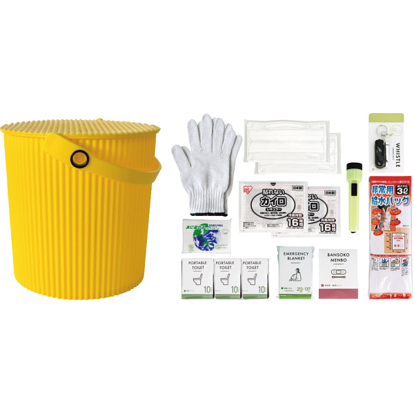内容 ●バケツ・蓄光LEDライト(単3乾電池2本使用・別売)・呼子笛・非常用給水バッグ・水に流せるペーパー・アルミブランケット・絆創膏&綿棒セット(医療機器製造販売届出番号37B3X10001000202)・軍手×各1、カイロ・マスク×各2、携帯トイレ×3●バケツ=耐熱温度約120℃・耐冷温度ー20℃、耐荷重(フタ全体)150kg、容量約10l 【ボール箱入】