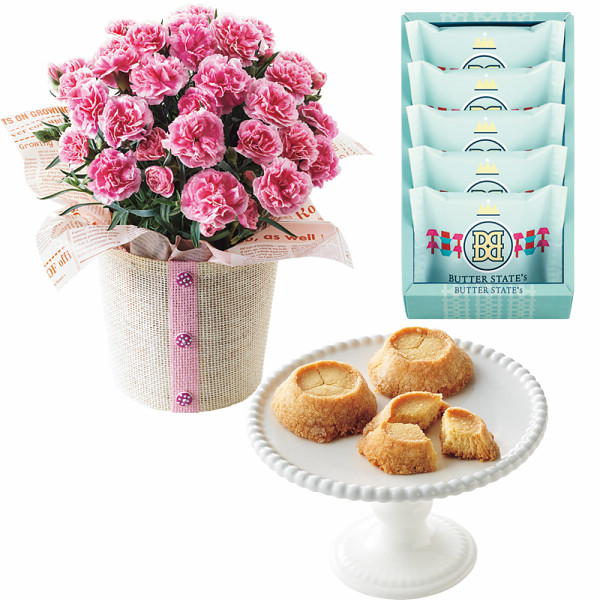カーネーション鉢植え「ティーパーティ」とバターステイツクッキーTHEバターリッチのセットです。ピンクのグラデーションが美しくレースのようなふんわりとした花姿が魅力的なカーネーションです。情熱こめて厳選配合したトリプルブレンドバターをたっぷり練りこみ、窯の熱でバターが溢れとろける「なだれとろけ製法」で香ばしく焼き上げました。