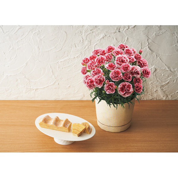 レースのような縁取りがとても可愛らしく華やかなカーネーションと外は香ばしく、中はしっとり、フランスパンのような食べ心地が魅力のバームクーヘンのセットです。濃い赤色に柔らかな白色の覆輪が入る花びらは、個性的です。