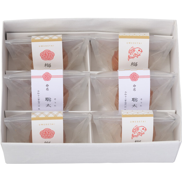 内容 ●梅で鯛×6(梅・鯛:和歌山県産)※内2個にお名入れ帯(お子様のお名前と生年月日を印字いたします。)※包装済商品です。 【アレルゲン:小麦】 【化粧箱入(包装済)】