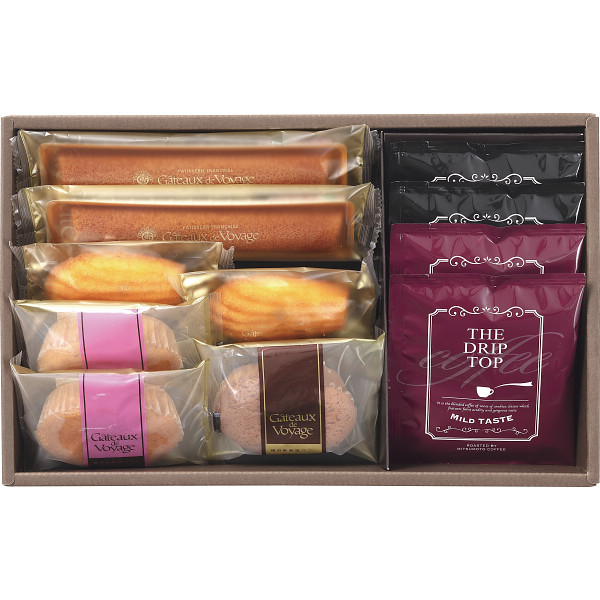 内容 ●バトン・オ・キャラメル×2、マドレーヌ×2、ガトースフレ(オーシャンベリー×2、塩キャラメル×1)、ドリップ珈琲(マイルドテイスト・ビターテイスト)×各2 【アレルゲン:卵・乳成分・小麦】 【化粧箱入】