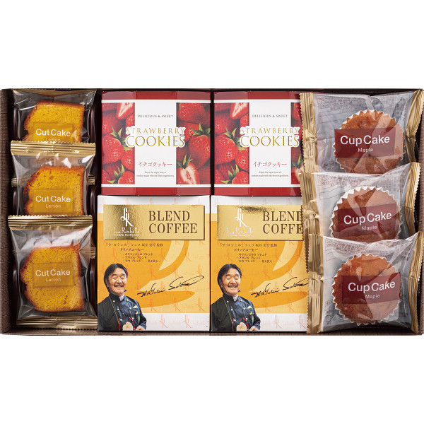 内容 ●坂井宏行シェフ監修ドリップコーヒー(ブラジルブレンド・モカブレンド・キリマンジャロブレンド×各1)×2、カップケーキ(メープル)・カットケーキ(レモン)×各3、イチゴクッキー50g×2 【アレルゲン:卵・乳成分・小麦】 【化粧箱入】