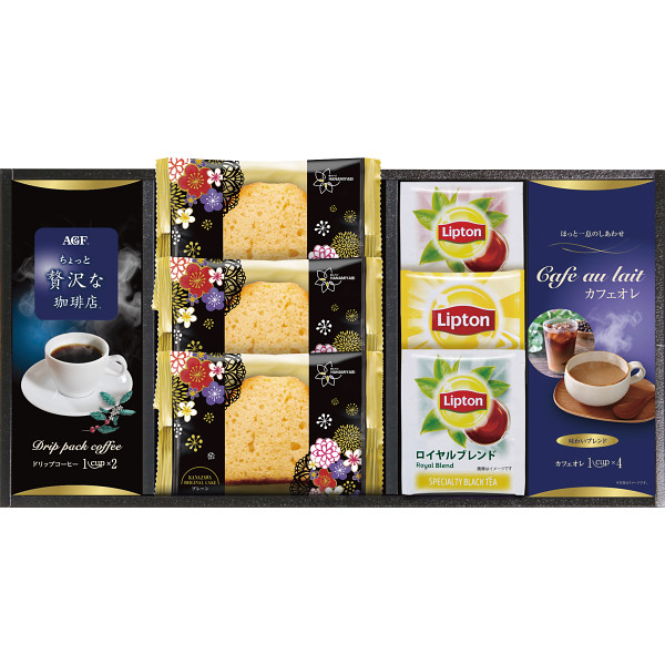 内容 ●金澤兼六製菓オリジナルケーキ(プレーン)×3、リプトン イエローラベルティーバッグ2g・リプトン セイロンティーバッグ2.2g・リプトン ロイヤルブレンドティーバッグ2.2g・AGFちょっと贅沢な珈琲店スペシャルブレンド(ドリップ)(7g×2)・カフェオレ(スティック)(12g×4)×各1 【アレルゲン:卵・乳成分・小麦】 【化粧箱入】