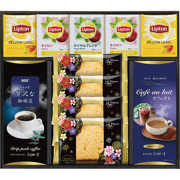 内容 ●金澤兼六製菓オリジナルケーキ(プレーン)×4、リプトン イエローラベルティーバッグ2g・リプトン セイロンティーバッグ2.2g×各2、リプトン ロイヤルブレンドティーバッグ2.2g・AGFちょっと贅沢な珈琲店スペシャルブレンド(ドリップ)(7g×2)・カフェオレ(スティック)(12g×4)×各1 【アレルゲン:卵・乳成分・小麦】 【化粧箱入】