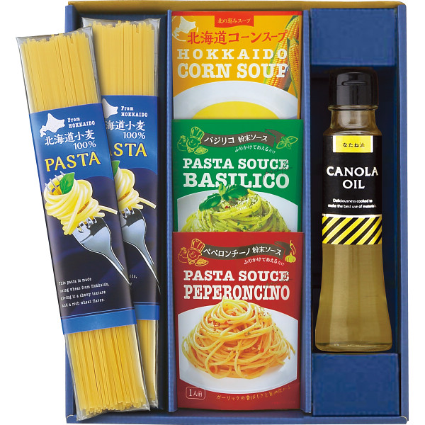内容 ●北海道小麦のパスタ80g×2、パスタシーズニング(ペペロンチーノ・バジリコ)各3g×各1、キャノーラ油90g×1、北海道コーンスープ16.5g×1 【アレルゲン:卵・乳成分・小麦】 【化粧箱入】