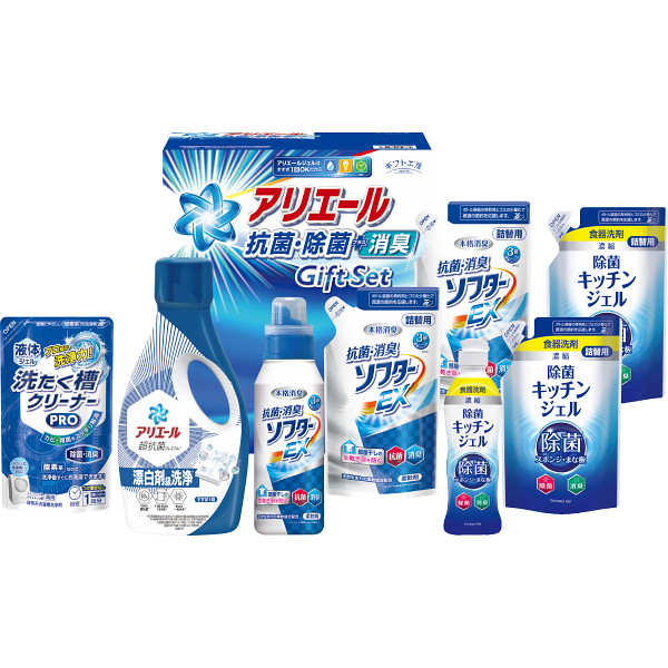 内容 ●P&Gアリエールジェル700g・除菌キッチンジェル200ml・抗菌消臭ソフターEX350g・液体洗たく槽クリーナーPRO200g×各1、除菌キッチンジェル(詰替用)160ml・抗菌消臭ソフターEX(詰替用)350g×各2 【化粧箱入】
