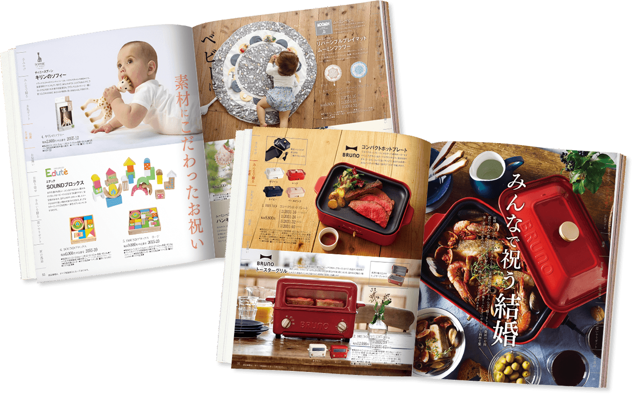 結婚祝いには新生活で使える家電なキッチン用品、出産祝いにはベビー用品や親子で楽しめるアイテムなど、ギフトシーンに合わせた贈りものを。