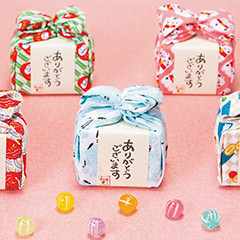 感謝の気持ちを伝える飴玉とハンカチのギフトです。感謝の気持ちが一目で伝わる「ありがとうございます」の書き文字。おめでたいモチーフをかわいらしい絵柄で表現しています。包みの中身は飴玉です。