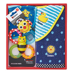 ベビーが喜ぶ定番おもちゃとベビーに欠かせないタオルビブで、お祝いにぴったりのプチギフトです。