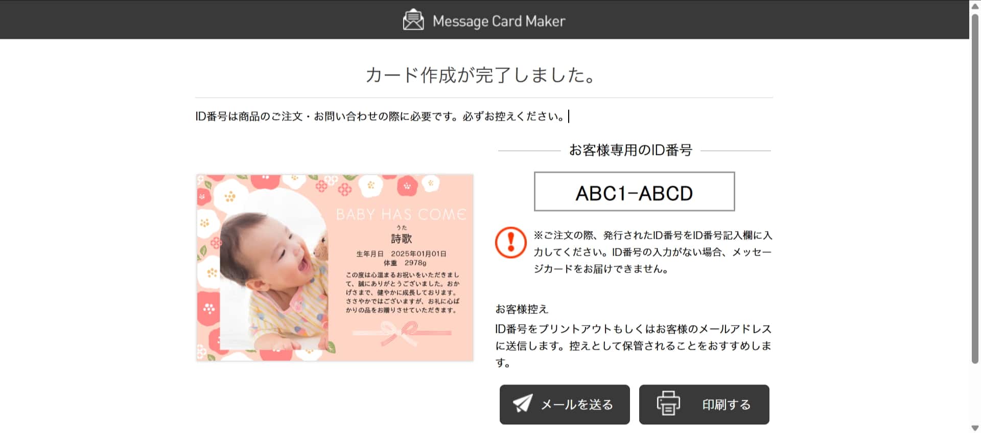 - (1) 作成いただいたメッセージカードのID番号発行ページは印刷して保管してください。