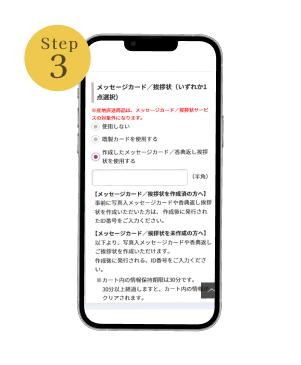- (1) 商品のご注文の際に、必ずご注文フォームのID番号入力欄にメッセージカードのご注文時に発行されたID番号をご入力の上ご注文ください。